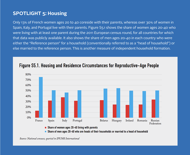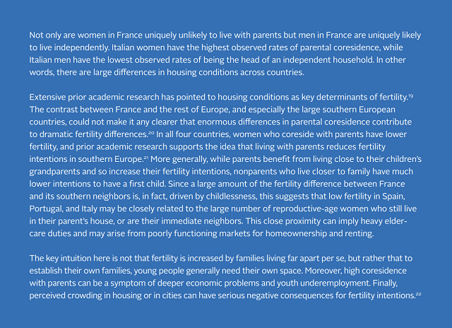 Key Point:Women in Spain, Italy, and Portugal appear to desire and intend smaller families than women in France, establishing an upper limit on what pronatal policy could achieve in the short run. However, low fertility desires may in some part be related to major structural differences in housing and extended family dynamics. While parents of small children benefit from grandparental help with kids, in general, young people who reside with their parents or are otherwise unable to form independent households are less likely to marry, desire fewer children, and have fewer children.