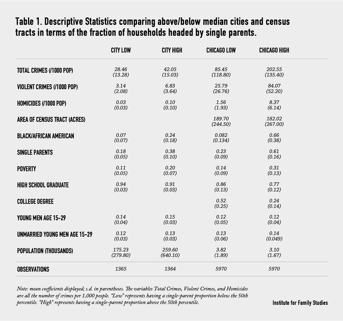 In Table 1, we provide some descriptive information about our two datasets. In each case, we split the observations based on whether they are in a location that is above or below the sample median fraction of households headed by a single parent. When we compare total crime rates of cities above or below the median fraction of singleparent households, we find that the total crime rates in the cities above the median are about 48% higher than for cities below the median. When we focus specifically on violent crimes or homicides, we find the difference is even larger, with a 118% increase in the rate of violent crimes and a 255% increase in the rate of homicides in cities that have higher levels of single parenthood. When we just look at the census tracts within Chicago, we see that these differences are even larger still, with a 137% increase in the total crime rate, a 226% increase in the violent crime rate, and a 436% increase in the homicide rate in communities with above the median rates of single parenthood.
