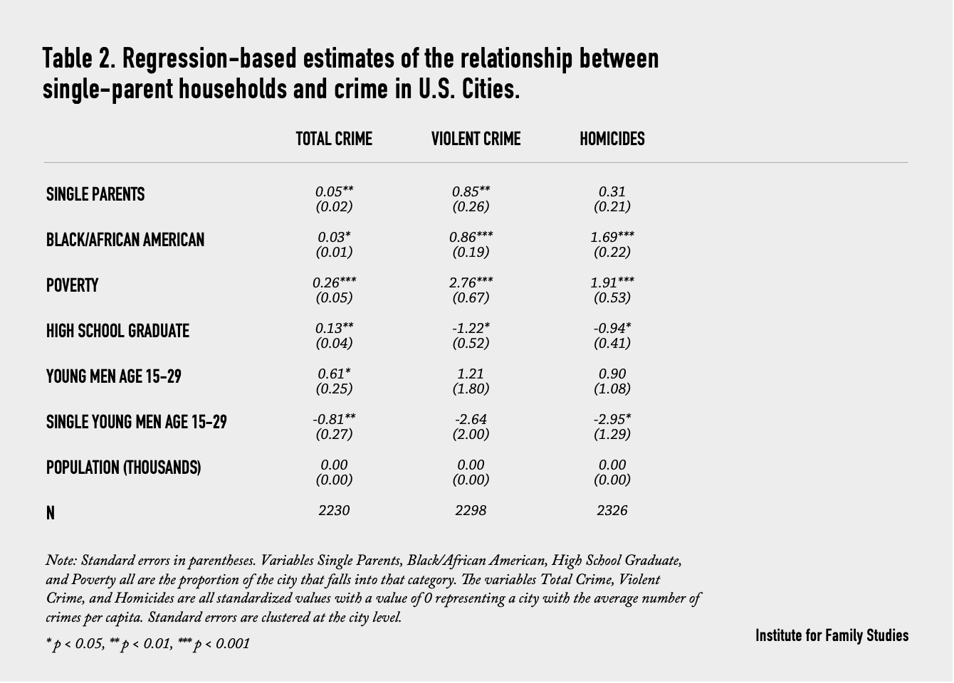 Table 2 provides regression-based estimates of the effect of the fraction of households headed by single parents on our three measures of violent crime for U.S. Cities. We standardize our outcome measure of crime per capita to have a mean of zero and a standard deviation of one for all three measures of violent crime. Therefore, the regression coefficients estimate the change in units of standard deviations that would result from a 100% increase in the proportion of single parents within a city/census tract.