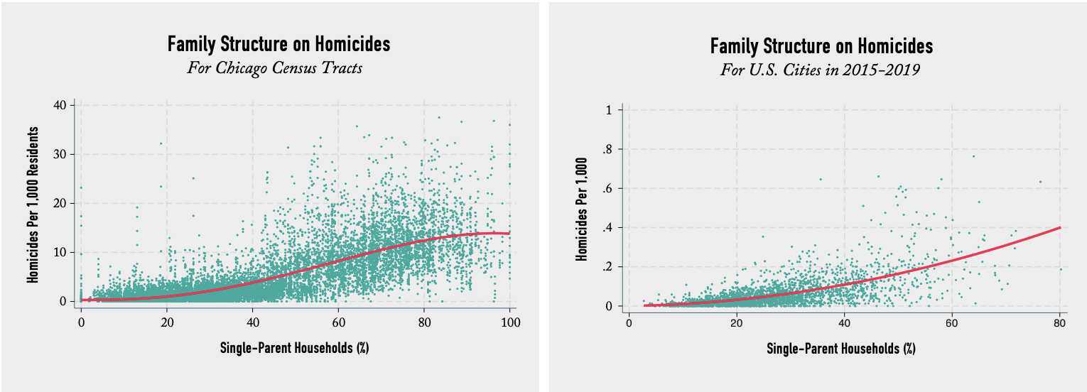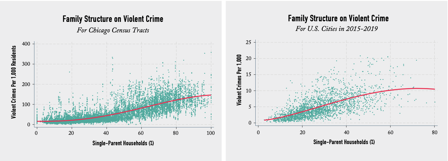 We find that cities are safer when two-parent families are dominant and more crime-ridden when family instability is common. The same story applies to the neighborhoods of Chicago. More specifically, we find the total crime rate is about 48% higher in cities that have above the median share of single-parent families, compared to cities that have fewer single-parent families. That difference is even larger with respect to violent crime and homicide, specifically, with cities above the median level of single parenthood experiencing 118% higher rates of violent crime and 255% higher rates of homicide. In the Windy City, relying on an analysis of census tract level data, our research indicates that neighborhoods above the median fraction of single-parent-headed households experienced 137% higher total crime rates, 226% higher violent crime rates, and 436% higher homicide rates.