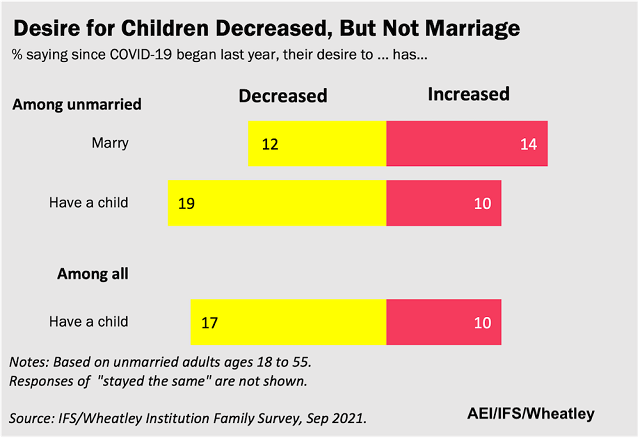 Our new report, The Divided State of Our Unions: Family Formation in (Post-)COVID America finds more evidence for the former thesis than the latter. On the one hand, interest in marriage among unmarried Americans looks stable and appears to have even ticked slightly upwards. According to a new IFS/Wheatley Family Survey conducted by YouGov in September of 2021, 14% of unmarried Americans ages 18-55 said their “desire to marry” has increased since the onset of COVID-19, compared to 12% who said it decreased. On the other hand, the share of Americans aged 18-55 reporting that their desire “to have a child” in the wake of COVID-19 moved downwards, with just 10% reporting an increased desire for children compared to 17% indicating their desire fell.