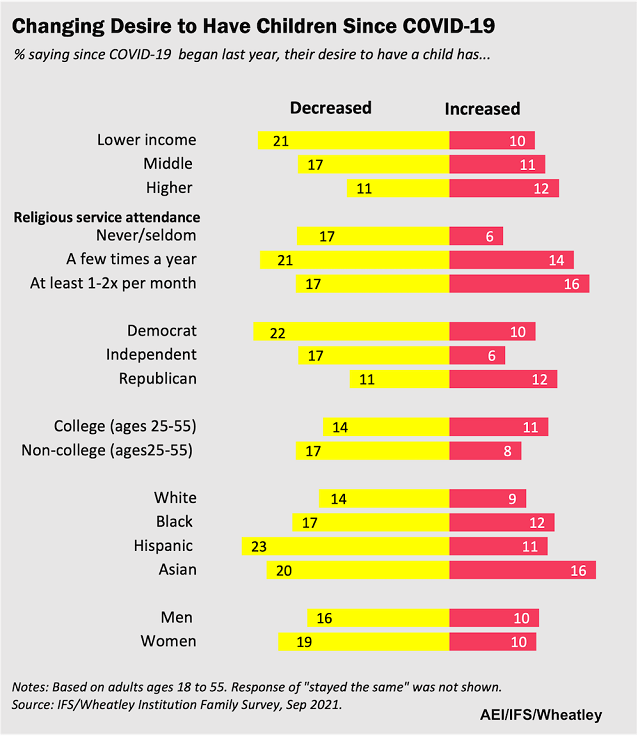 But we also see evidence that interest in having children has declined more among the poor, possibly reflecting greater concern among them about the financial uncertainty unleashed by the pandemic. This would depolarize trends in parenthood since the poor have traditionally been more likely to have children than other Americans. But in most ways, as this report makes clear, COVID-19 appears to have amplified pre-existing family fissures in the American landscape.