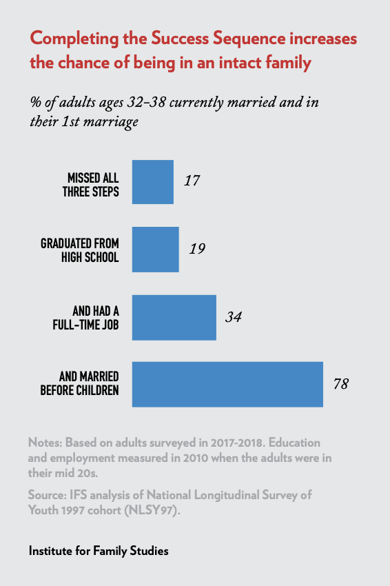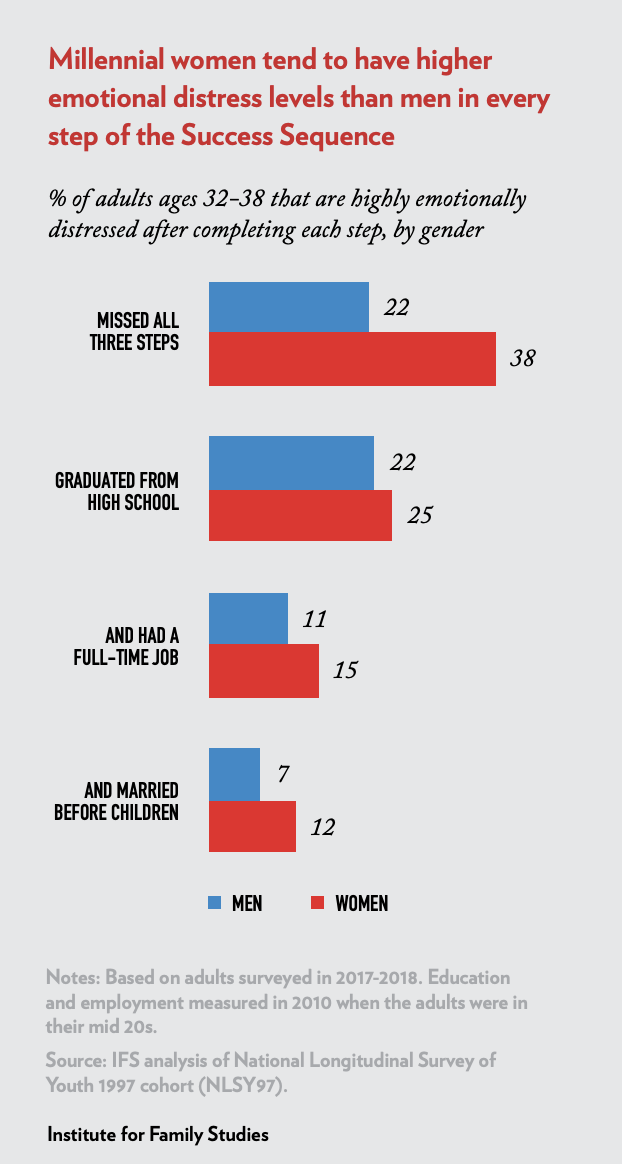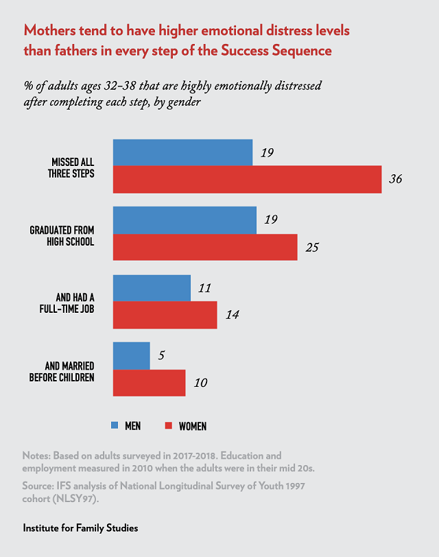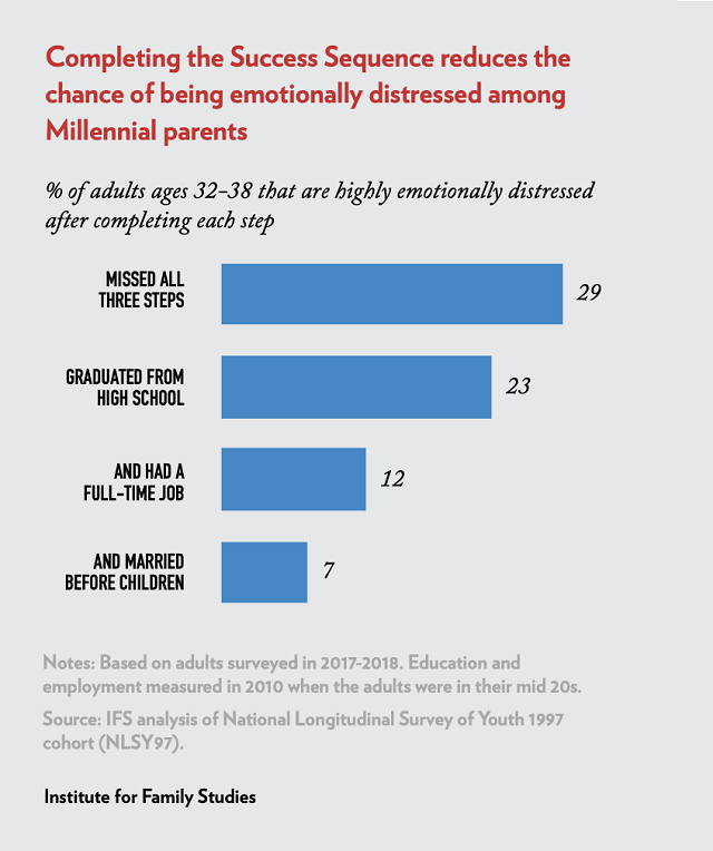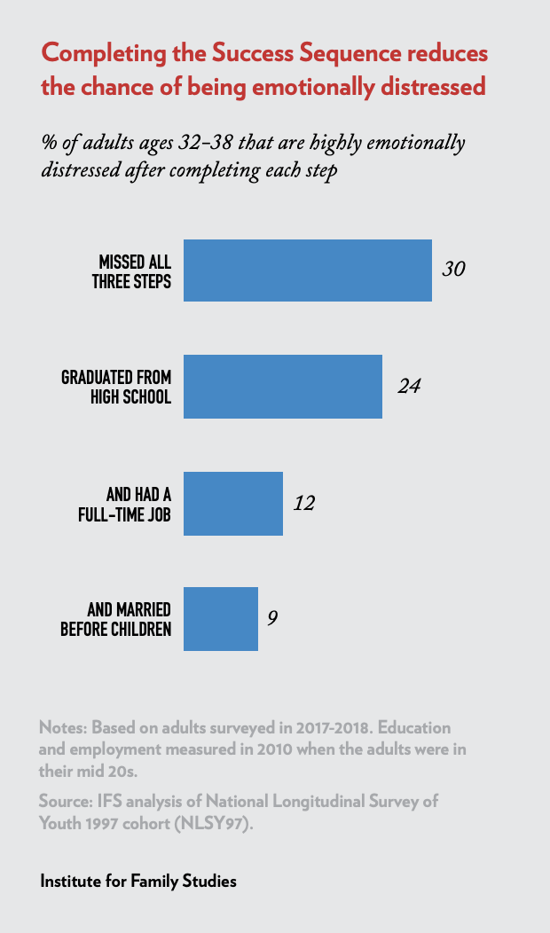 The Success Sequence—completing at least a high school education, securing full-time employment in their 20s, and marrying before having children—not only offers a promising path for young adults to achieve economic success but is also closely linked to emotional and mental well-being. Moreover, the ways in which the Success Sequence contributes to mental health are not limited to financial success but also to the higher levels of family stability associated with following this path.