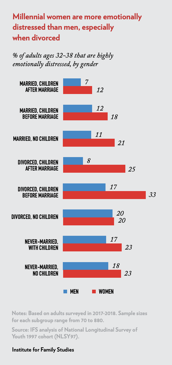 In contrast, divorced Millennial women who had children after marriage suffer less emotional distress. About 1 in 4 of these women reported being highly emotionally distressed. This is similar to the emotional distress levels among never-married women (with or without children).