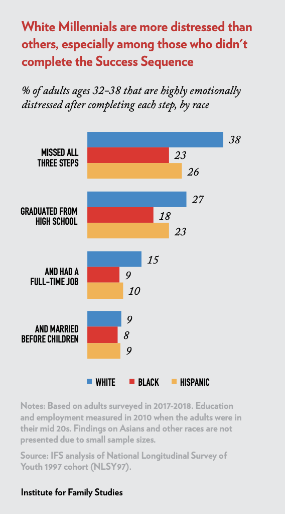 With completion of each step of the Success Sequence, the racial gap narrows. For Millennials who followed all three steps, the share of highly emotionally stressed young adults drops to 9% for whites, 8% for bBlacks, and 9% for Hispanics. The racial gap in emotional well-being is almost closed.