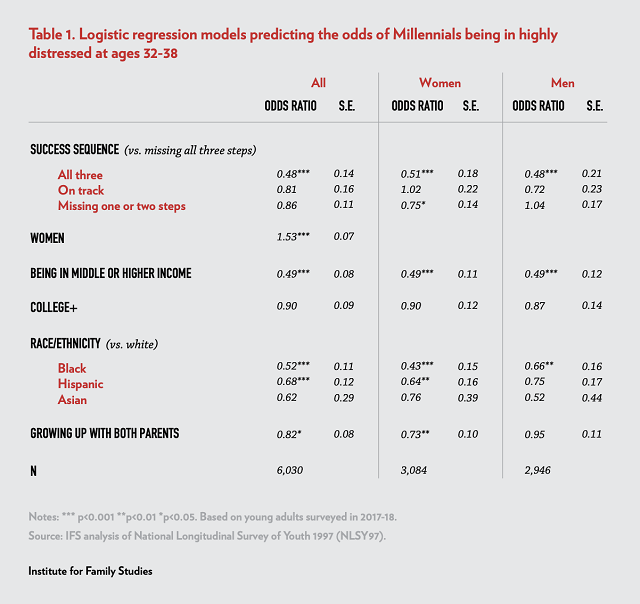 Our findings demonstrate that young adults who’ve followed the three steps of the Success Sequence experience significantly better mental health by their mid-30s compared with those who have not. This is true even after accounting for various background factors such as income, gender, and race. The odds of experiencing high emotional distress are reduced by about 50% for those who have completed each step.