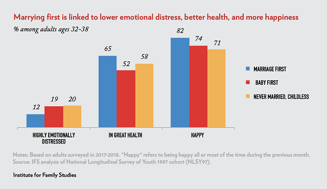 Marrying first is not only linked to a lower chance of emotional distress, but also to better general health and overall happiness. Millennials who married before having children are more likely than those who had children first to report being in great overall health when reaching their mid-30s (65% vs. 52%) and being happy all or most of the time (82% vs. 74%).