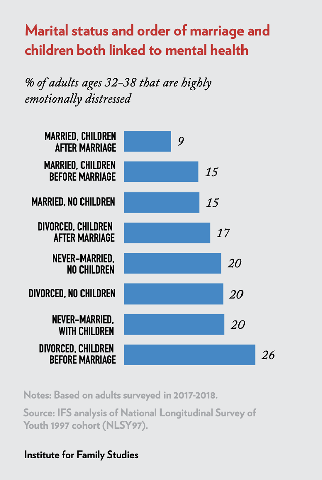 Divorce takes a toll on mental health. However, even among divorced young adults, the order of children and marriage is still linked to better mental well-being. Some 17% of divorced Millennials who became parents after marriage are highly stressed emotionally, compared with 26% of their peers who had children before marriage.